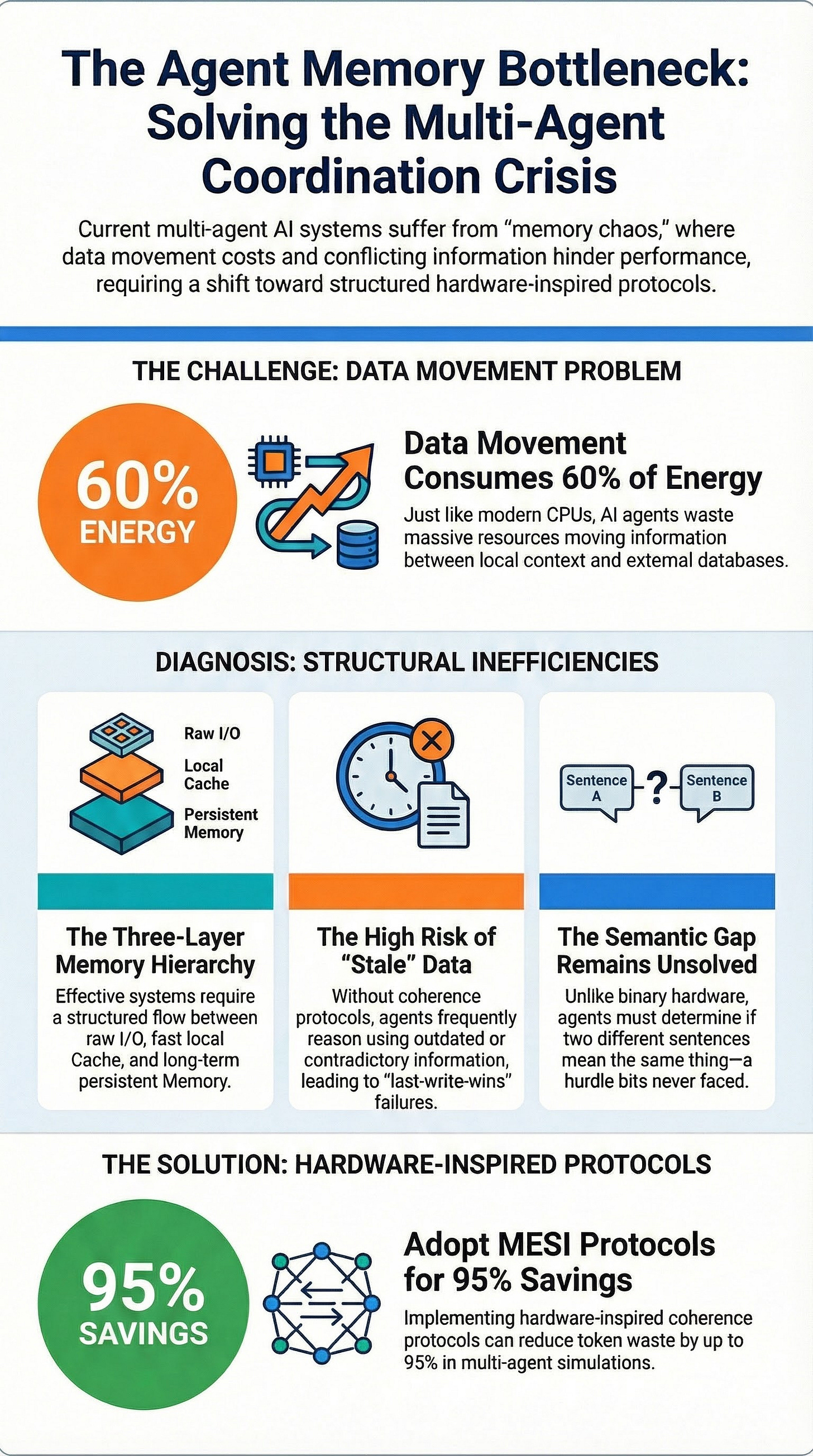 Proven Solutions: Protocols developed for hardware (MESI, MOESI, NUMA) provide a blueprint for maintaining memory coherence and consistency, potentially reducing token waste by up to 95%.