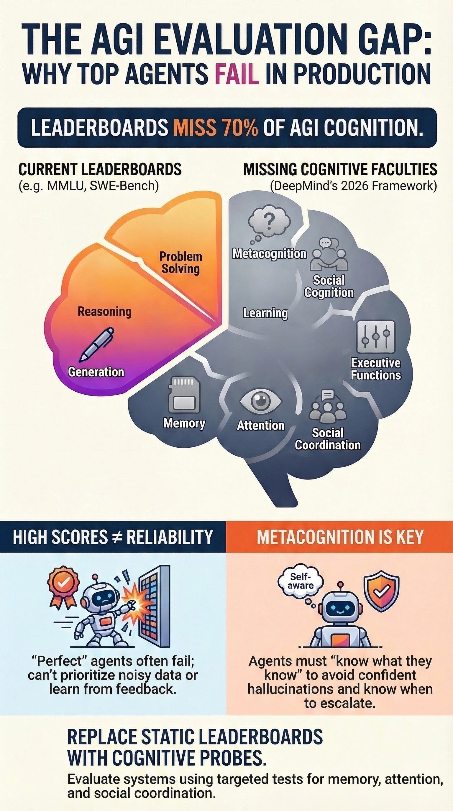 The core finding is a significant “evaluation gap” in current industry standards. While popular benchmarks like MMLU and SWE-Bench effectively measure Reasoning, Problem Solving, and Generation, they largely ignore Perception, Attention, Learning, Memory, Metacognition, Executive Functions, and Social Cognition. To address this, DeepMind has initiated efforts to operationalize these neglected areas through a $200,000 Kaggle hackathon and the proposal of targeted “evaluation probes.” For agent developers, the framework serves as a systems-architecture checklist to identify failure modes—such as overconfidence and inability to prioritize noisy tool outputs—that remain invisible to current evaluation methods.