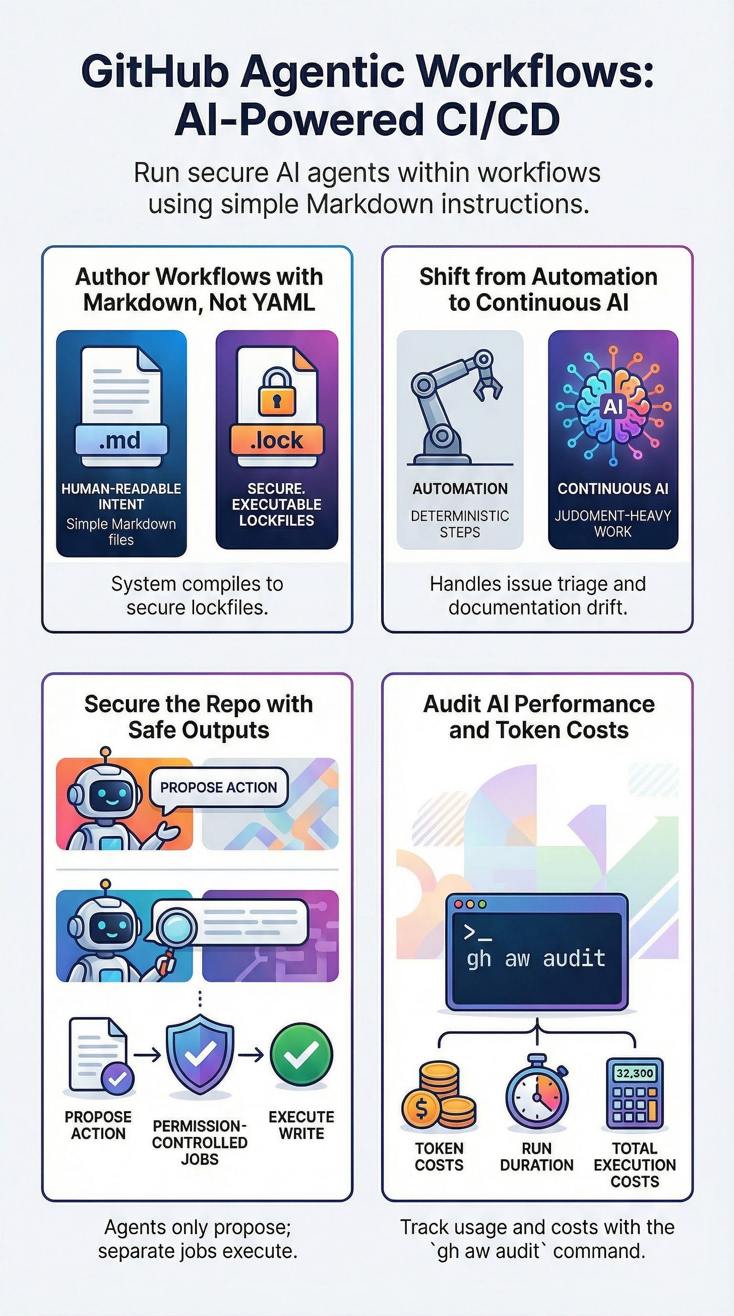 GitHub has introduced Agentic Workflows, currently in technical preview (announced February 13, 2026), marking a shift from deterministic CI/CD toward “Continuous AI.” This capability allows developers to run AI coding agents within GitHub Actions to handle judgment-heavy repository tasks—such as issue triage, security reviews, and documentation maintenance—using natural language instructions.