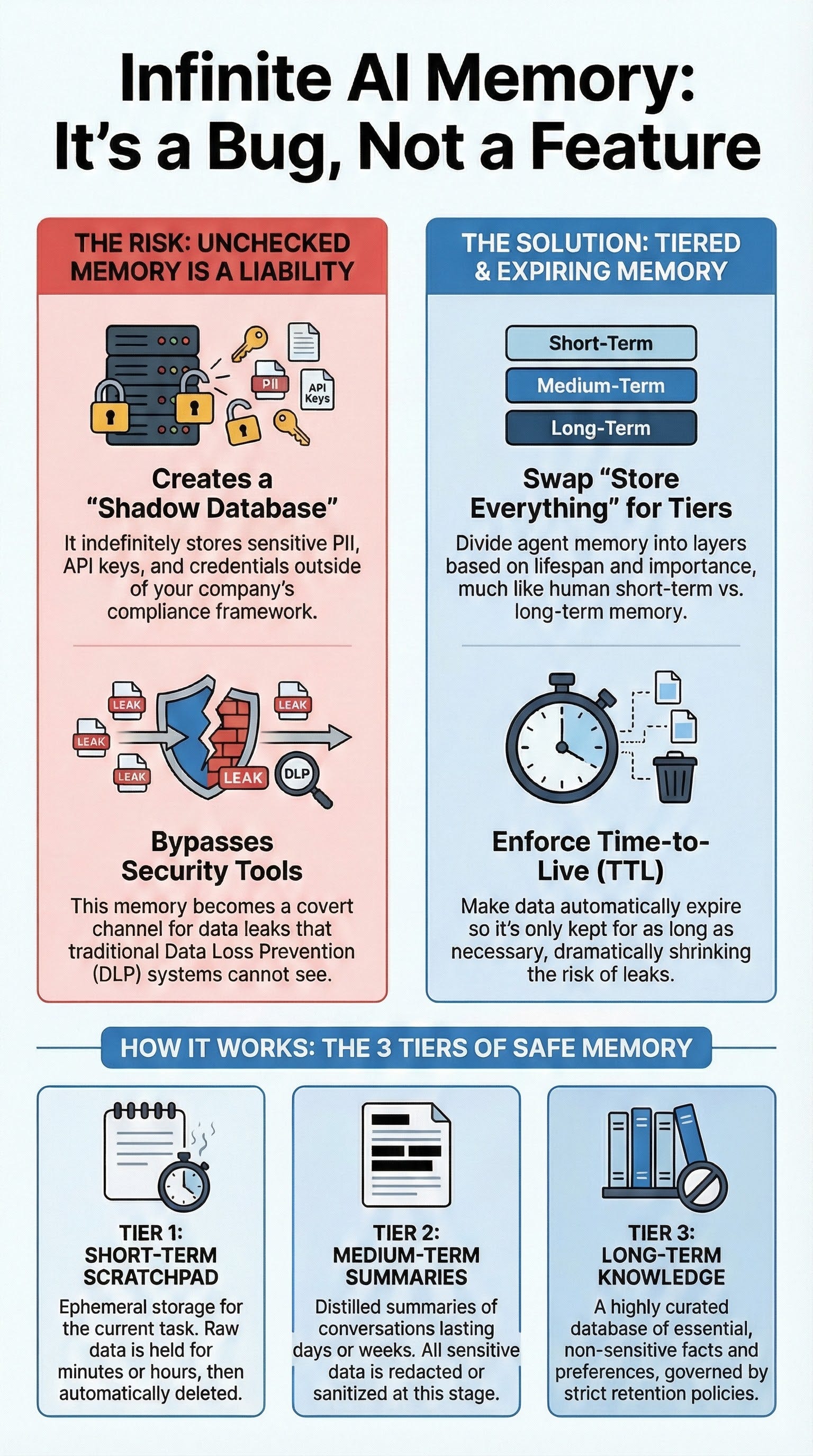 The most effective mitigation strategy is to replace the naive “hoard everything” approach with a sophisticated, tiered memory architecture that incorporates data expiration (TTL) and sanitization. This design balances the agent’s need for context with the imperative for security by treating recent and long-term information differently. It is analogous to a human assistant who uses a temporary notepad for immediate details, summarizes key points into a report, and files only the essential, non-sensitive conclusions for long-term reference.