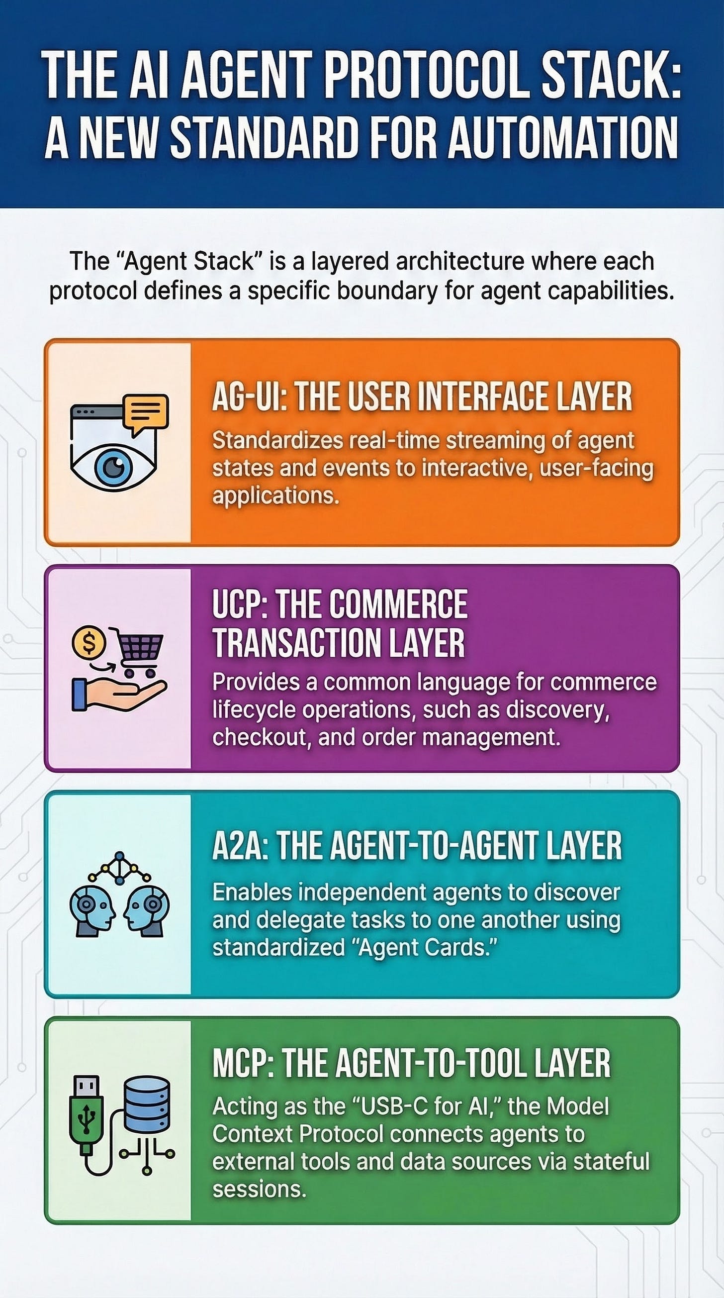 The Layered Composition Model: Modern agent architecture now utilizes a specialized stack where MCP connects agents to data, A2A enables inter-agent collaboration, UCP standardizes commerce, and AG-UI manages real-time user interaction.